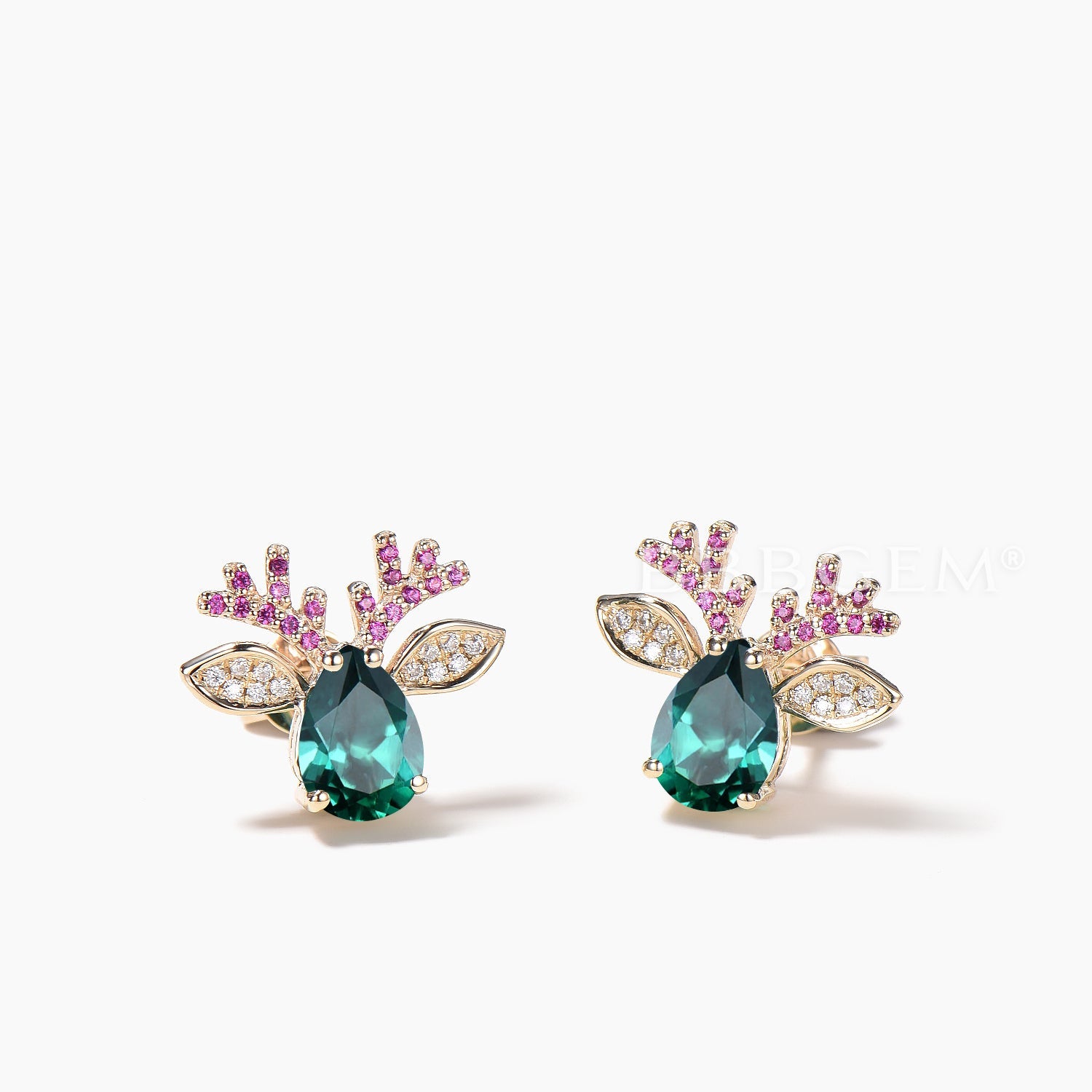 Teardrop Cut Emerald Stud Earrings Ruby Diamond Christmas Reindeer Earrings