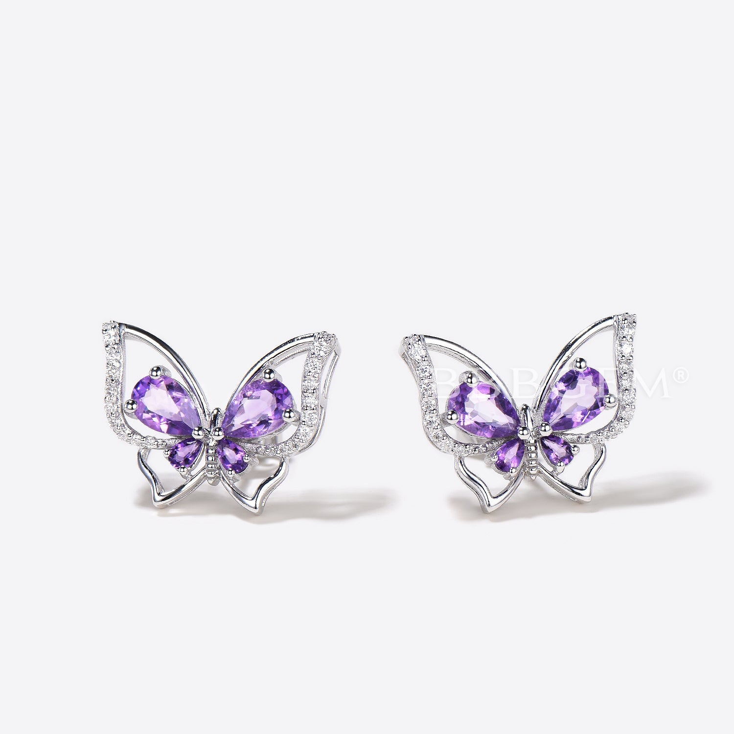 Featuring vibrant teardrop-shaped amethysts as the centerpiece, they radiate natural beauty. Delicate butterfly accents adorned with sparkling diamonds add a playful yet sophisticated touch.?
