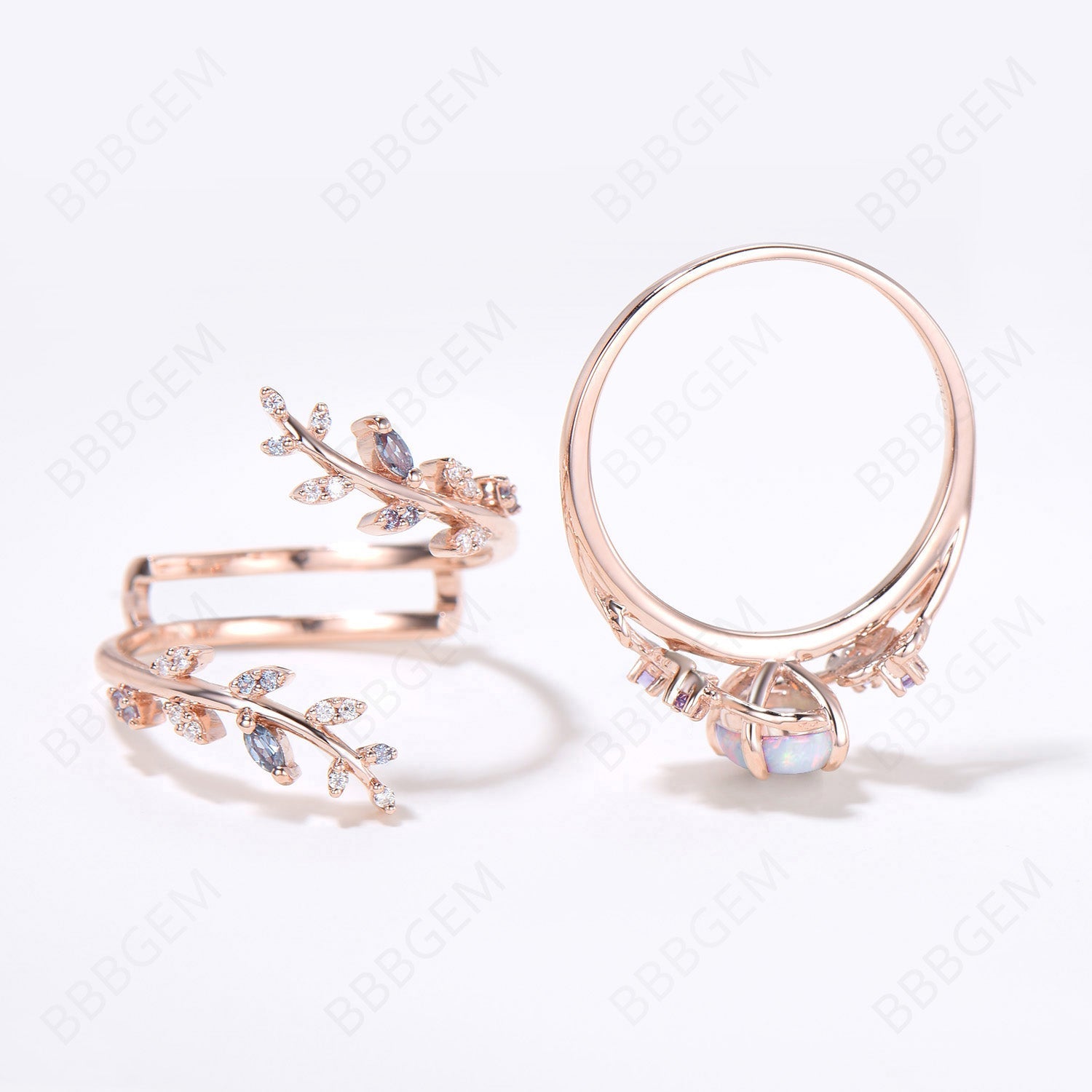Branch Opal Engagement Ring Oval White Opal Bridal Set Nature Inspired Leaf Alexandrite Ring Rose Gold Wedding Band Enhancer Guard Ring