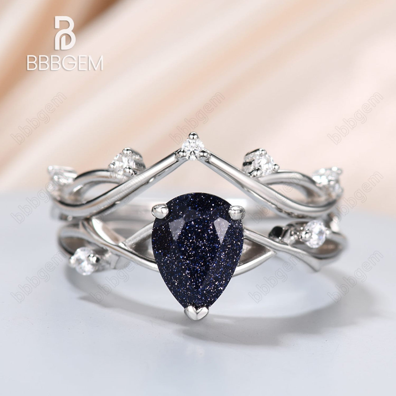 Budding Willow Solitaire Pear Blue Sandstone Engagement Ring Set Unique Twig Vine Teardrop Blue Goldstone Ring White Gold