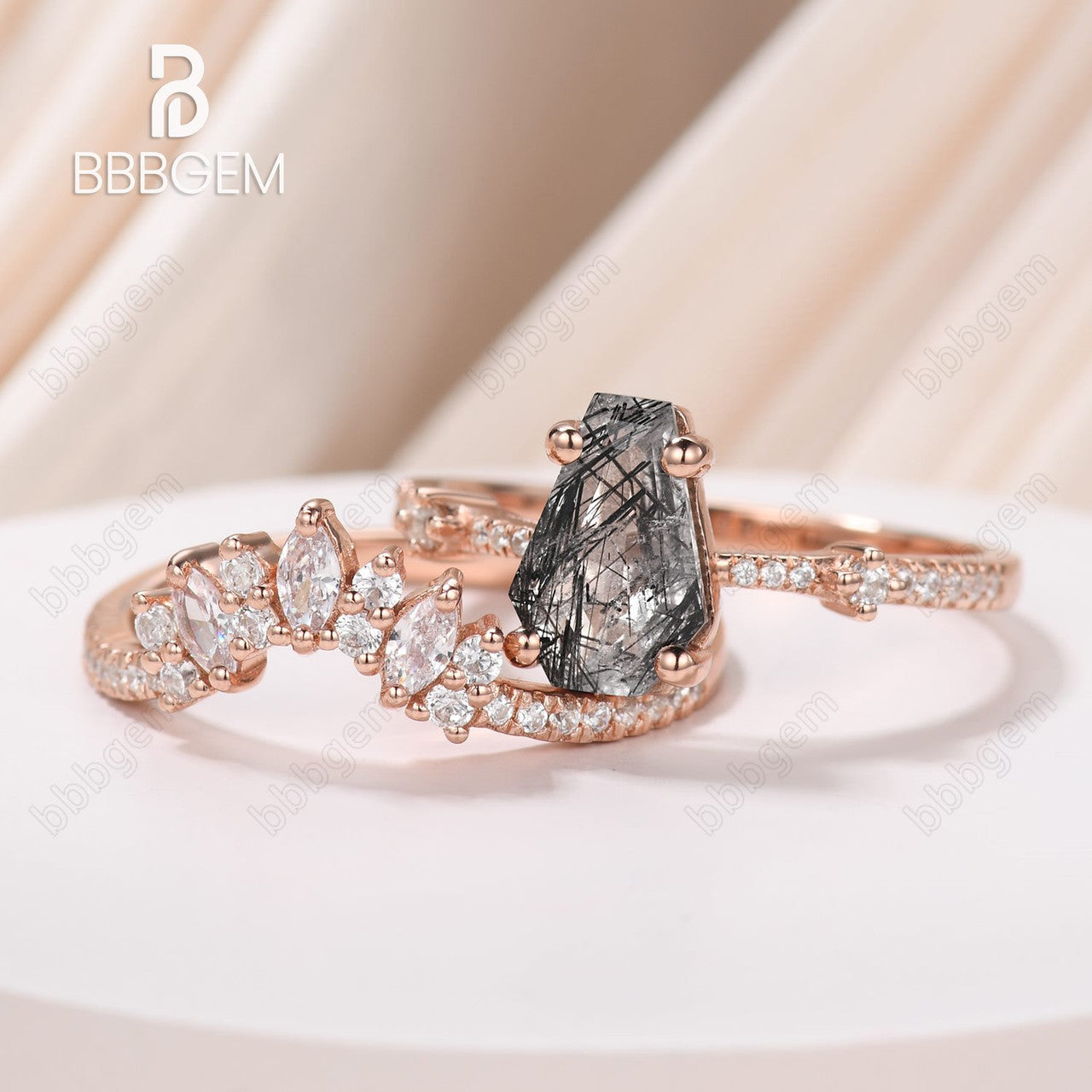 Dark Night Black Coffin Cut Wedding Ring Set Natural Rutilated Quartz Promise Bridal Set
