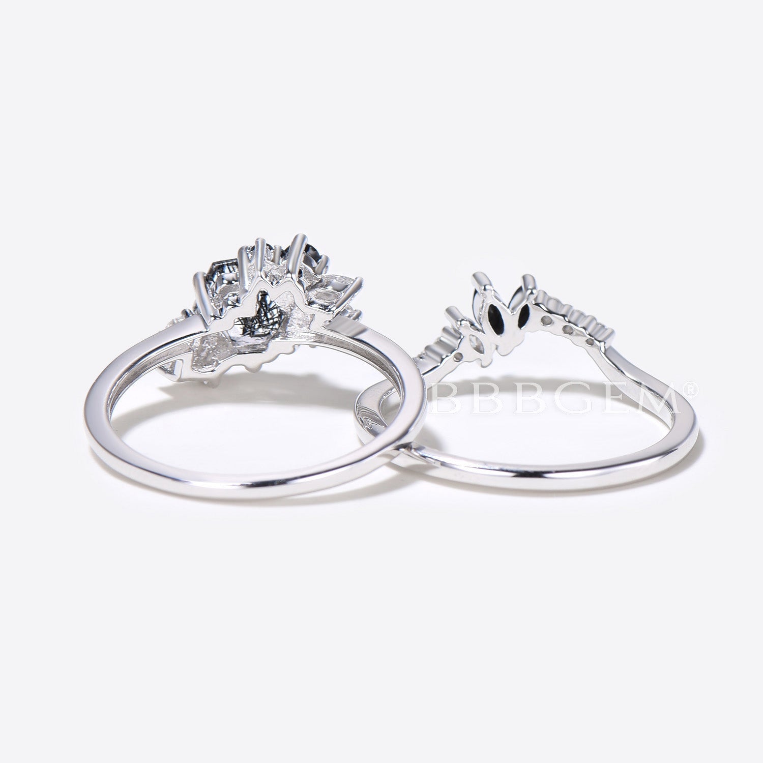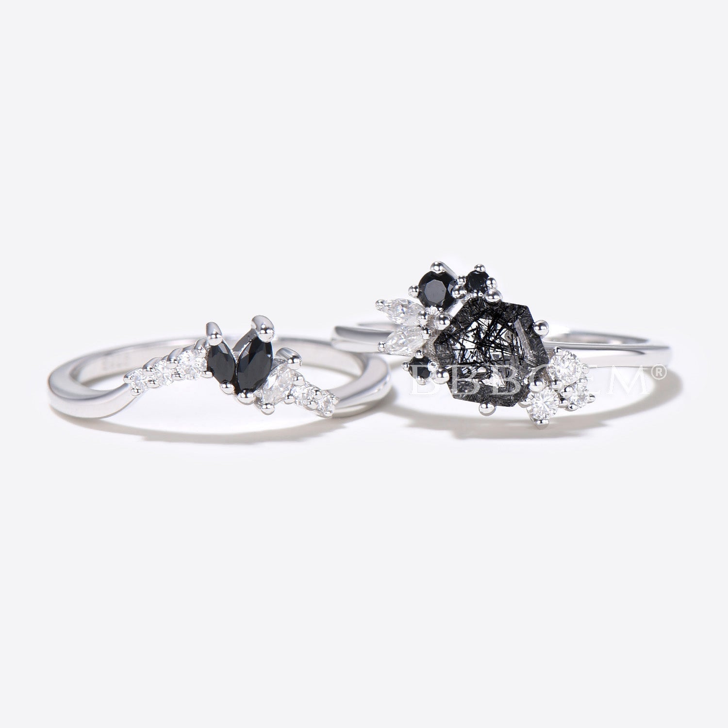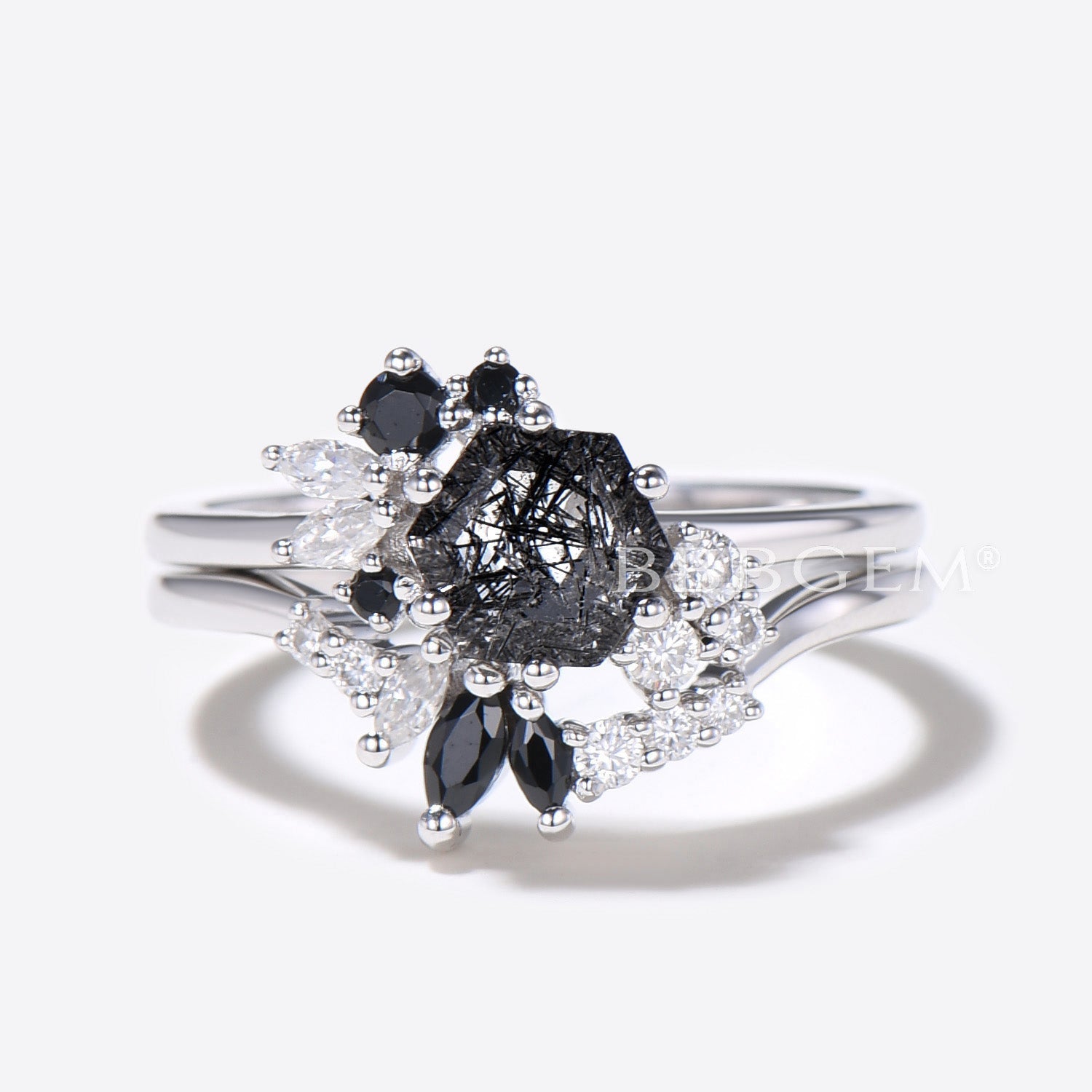 Hexagon Cut Black Rutilated Quartz Ring Cluster Moissanite Ring