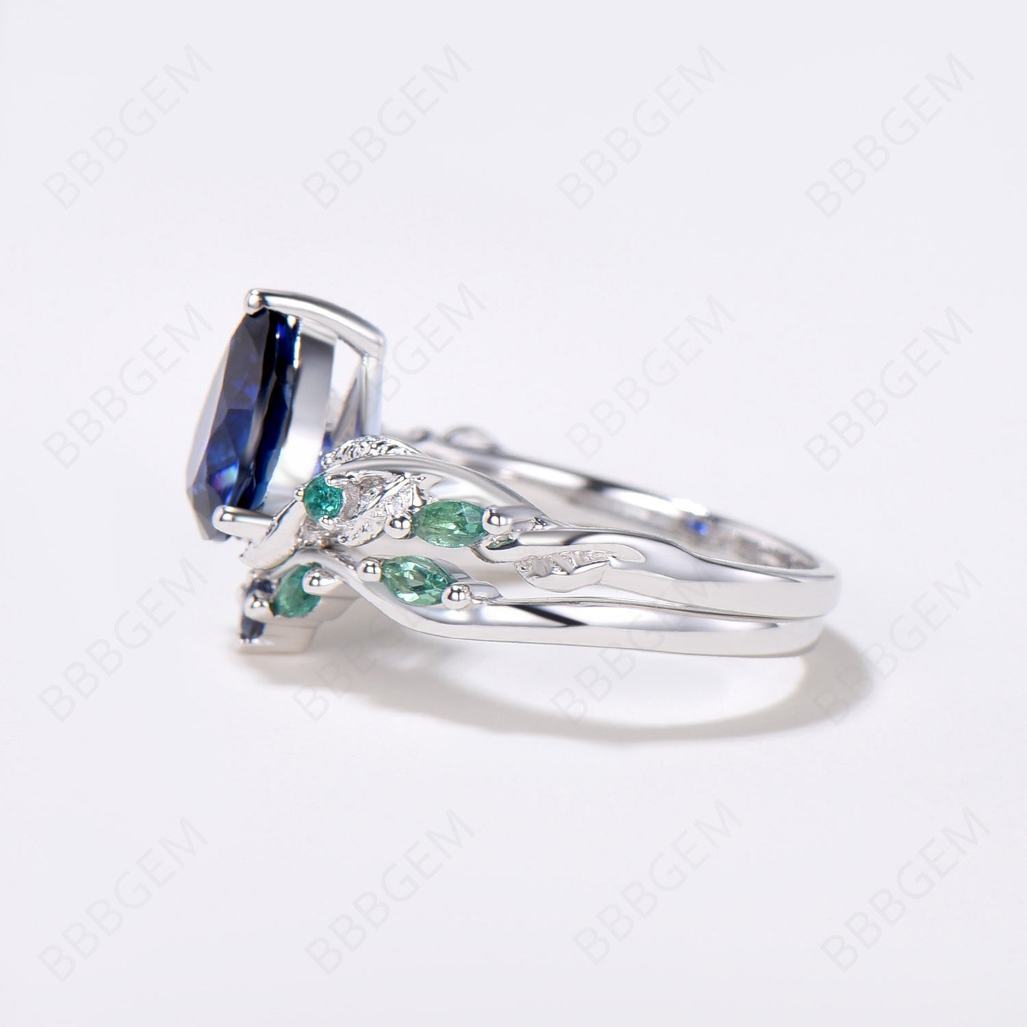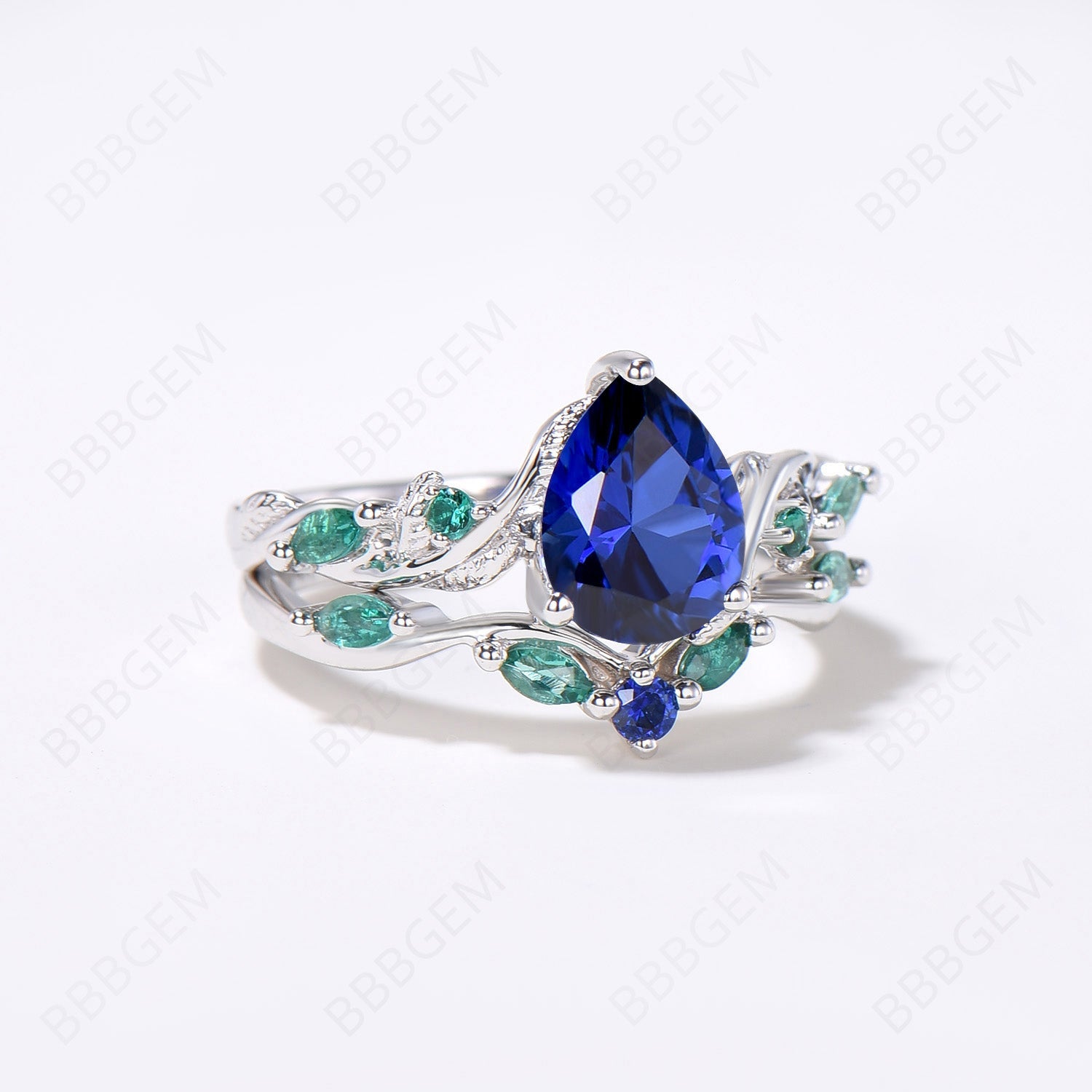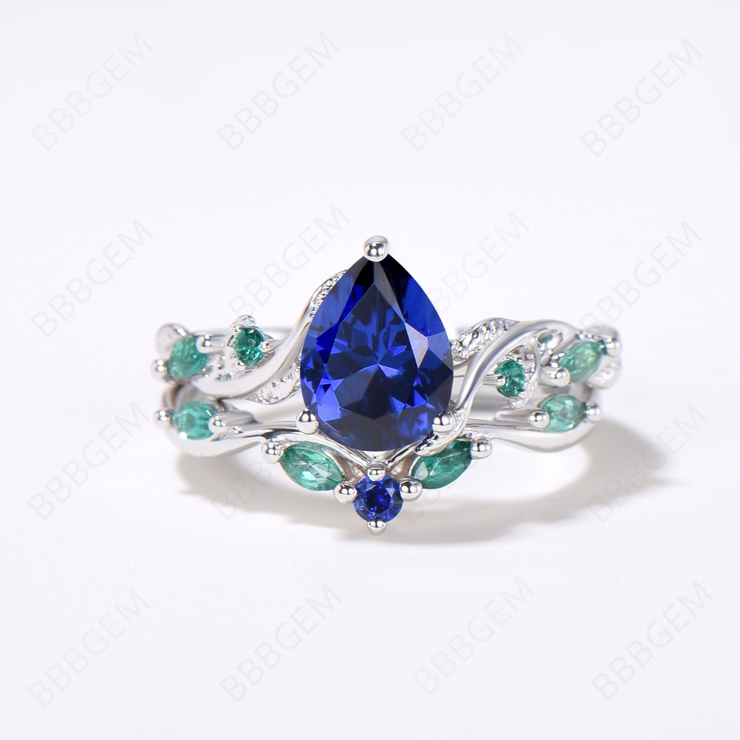 Nature Inspired Pear Blue Sapphire Ring Set Vintage Sapphire Emerald Bridal Ring Set Twig Leaf Vine Wedding Ring September Birthstone Jewelry