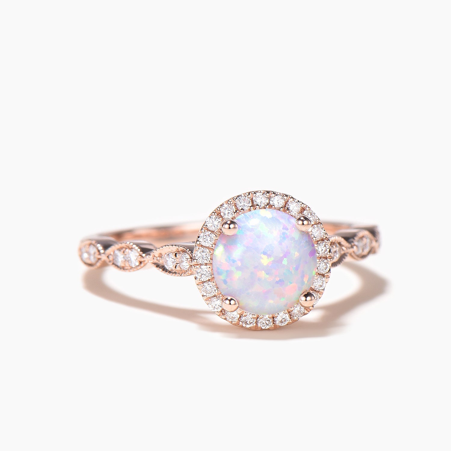 Opal Engagement Ring Halo 14k Rose Gold Moissanite Scalloped Milgrain Wedding Band Anniversary Gift
