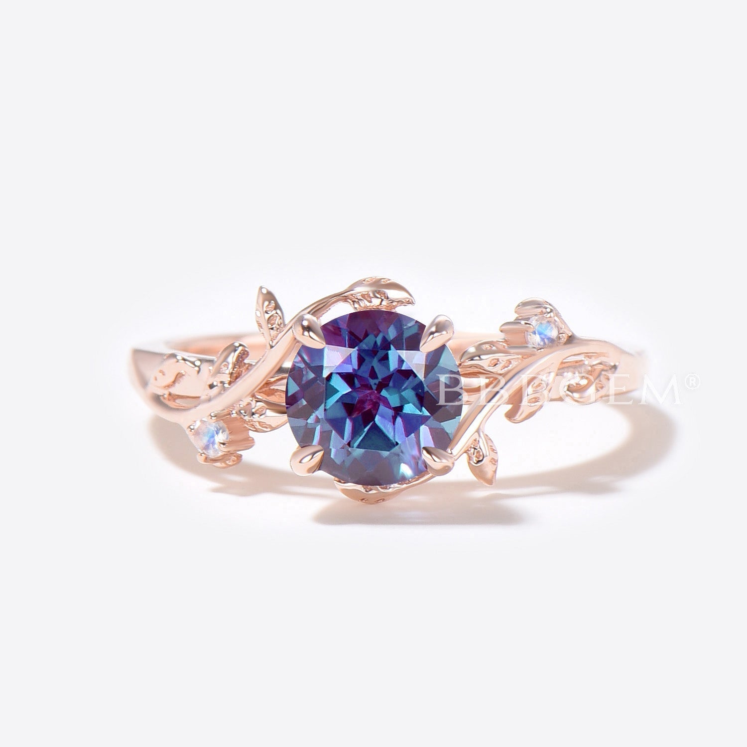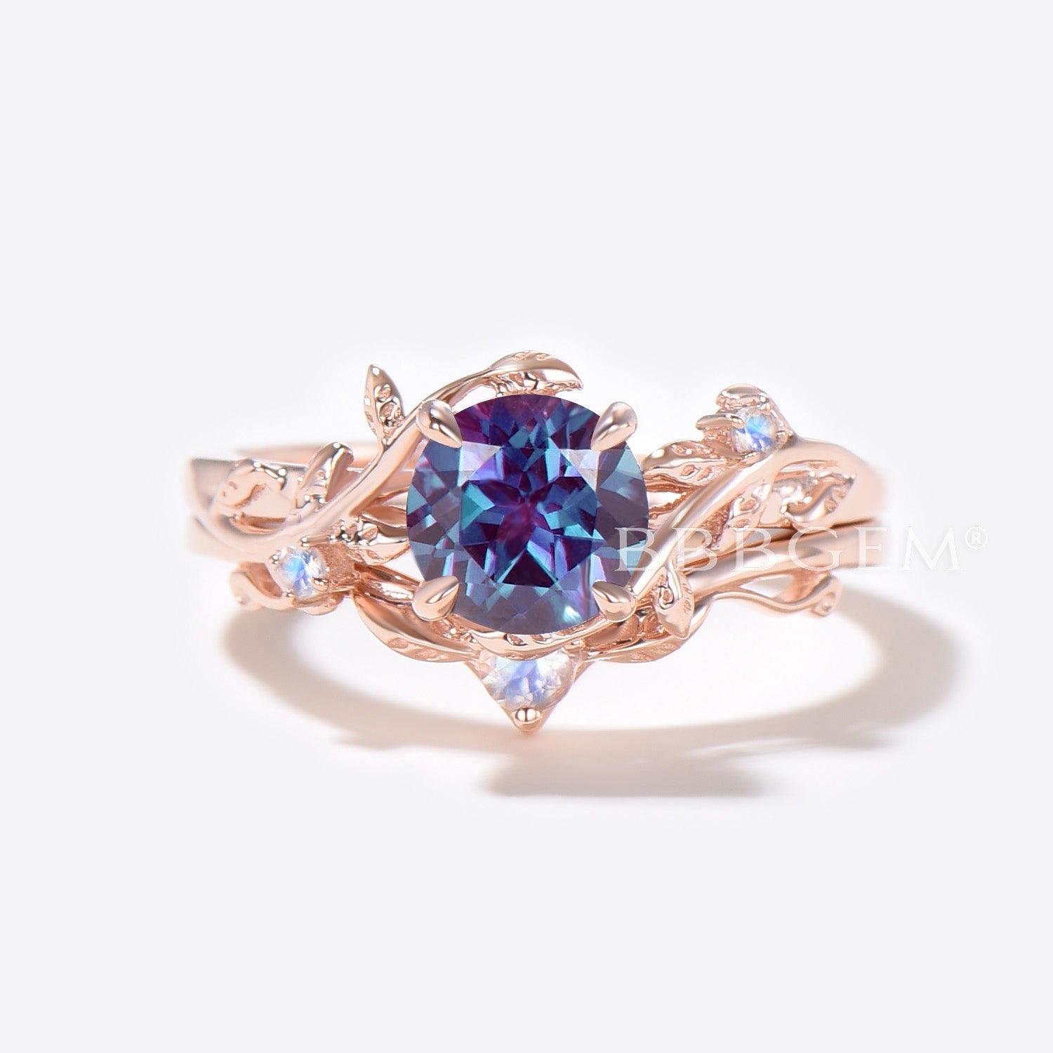 Rose Gold Leaf Round Alexandrite Engagement Ring Set Branch Vine Moonstone Bridal Set