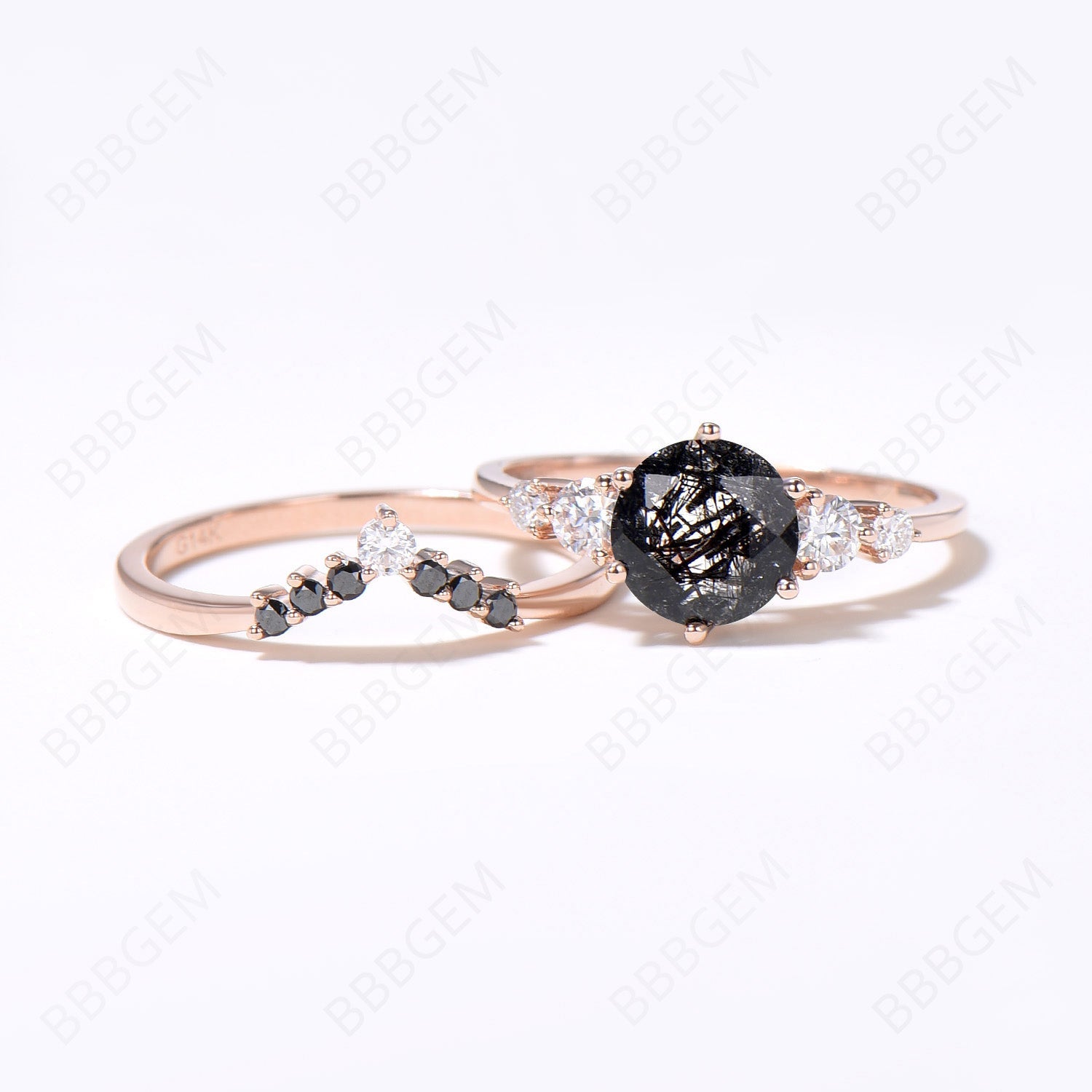 Round Cut Natural Black Rutilated Quartz Engagement Ring Set Vintage 5 Stone Moissanite Ring 14k Rose Gold Black Diamond Bridal Set