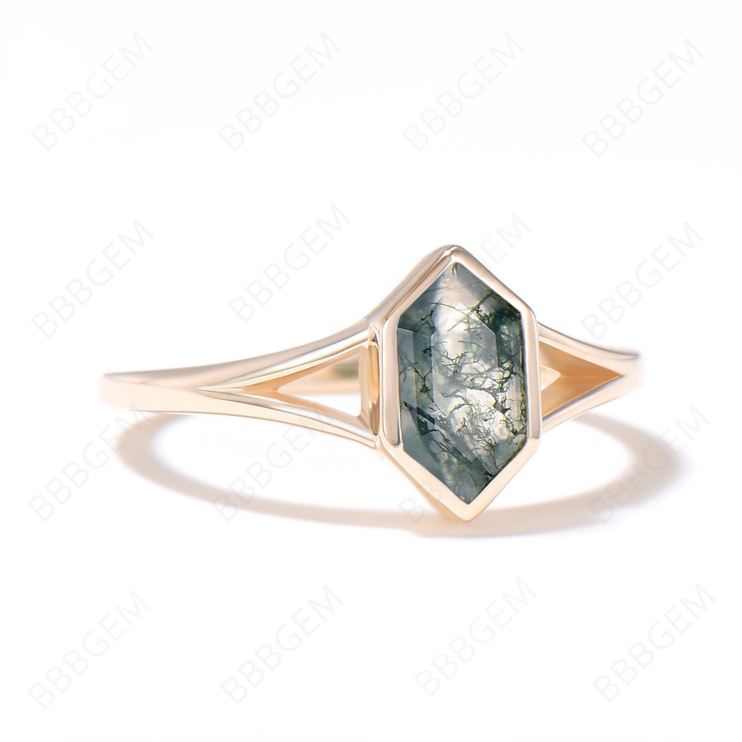 Unique Long Hexagon Cut Natural Moss Agate Ring 14k Solid Gold Green Agate Solitaire Ring Art Deco Split Shank Ring Bezel Set Promise Ring
