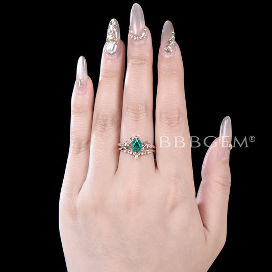 Twig Teardrop Emerald Engagement Ring Set Branch Leaf Ring