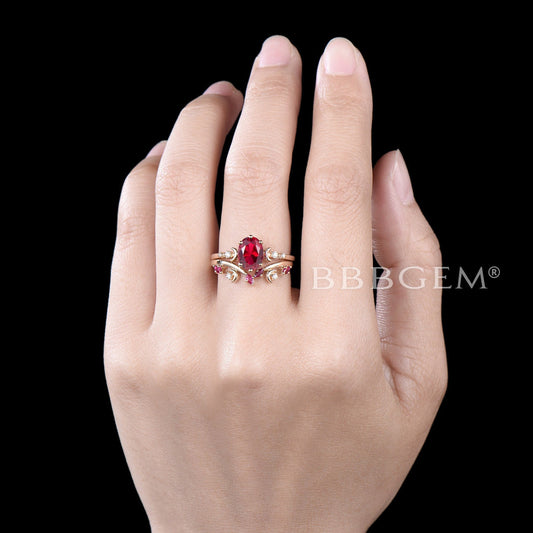 Crescent Moon Ruby Ring Oval Cut Red Ruby Engagement Ring Set
