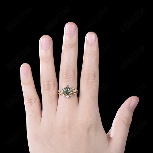 Nature Inspired Twig Leaf Pear Moss Agate Engagement Ring Set