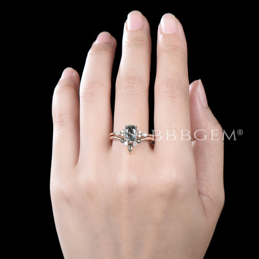 7 Stone Moss Agate Engagement Ring Set Moissanite Bridal Set