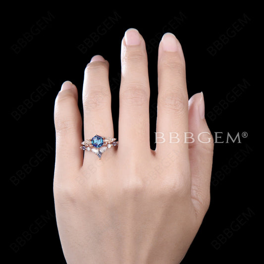 Leaf Engagement Ring Hexagon Cut Alexandrite Wedding Ring Set