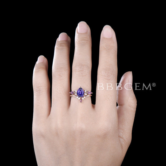 Pear Shaped Alexandrite Engagement Ring Blue Sapphire Cluster Ring