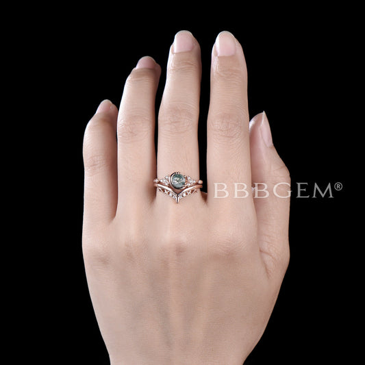Celtic Knot Moss Agate Engagement Ring Set Moon Moissanite Ring