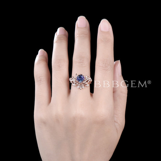 Rose Gold Leaf Round Alexandrite Engagement Ring Set Branch Vine Moonstone Bridal Set