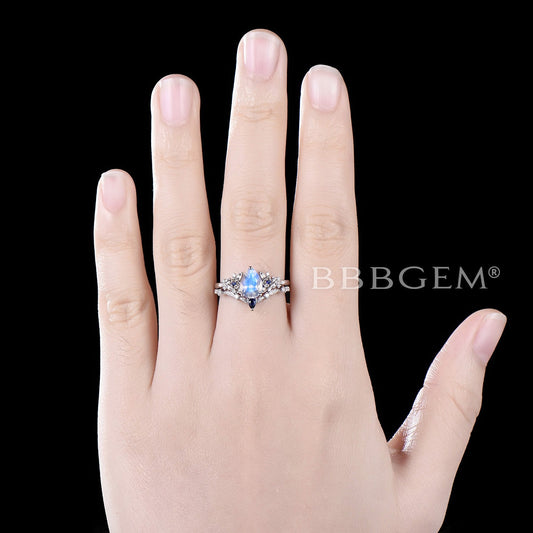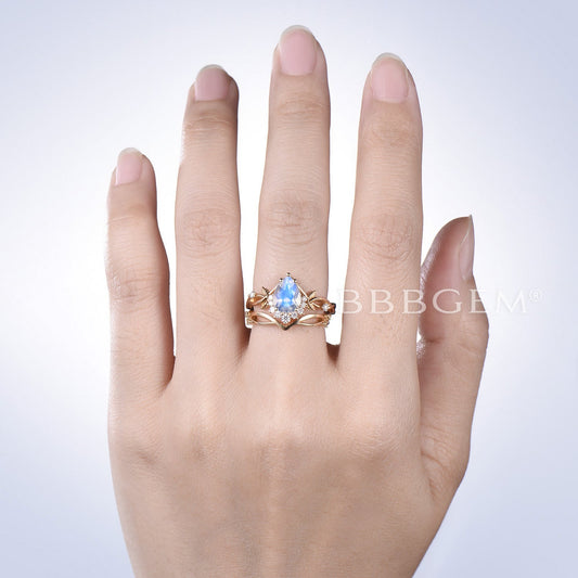 Pear Natural Moonstone Engagement Ring Leaf Floral Wedding Ring Set