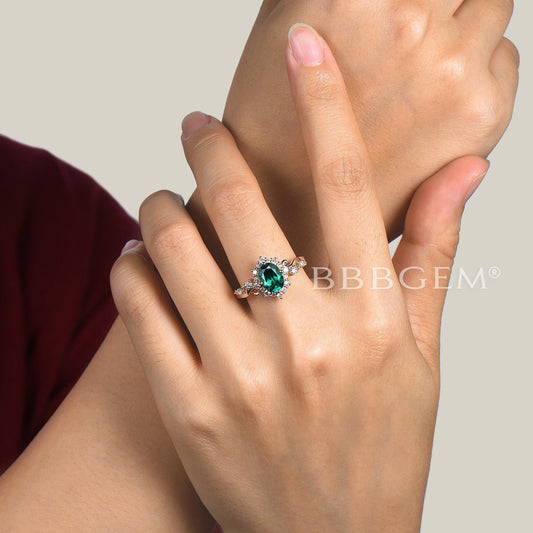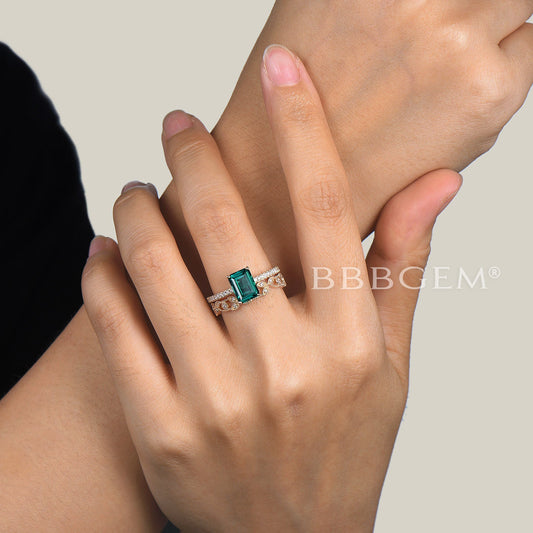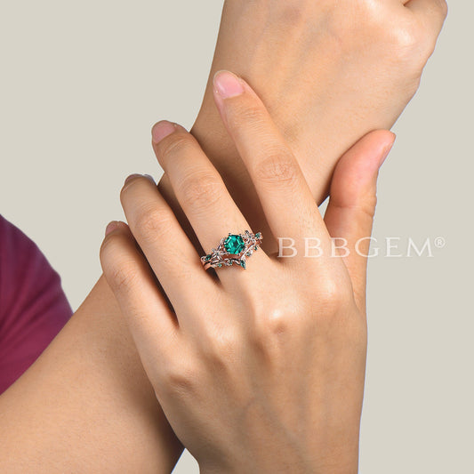 14k Gold Green Emerald Engagement Ring Set Vine Branch Diamond Ring