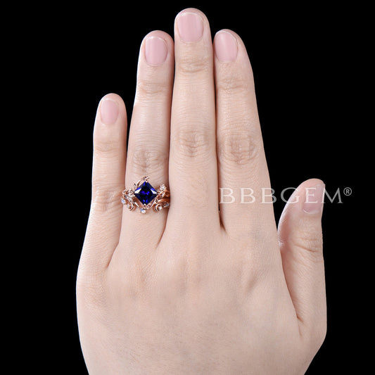 Moon Leaf Princess Cut Blue Sapphire Engagement Ring Nature Inspired Ring