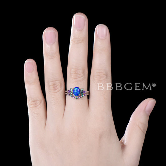 Unique 1.5ct Oval Cut Blue Opal Engagement Ring Set Sterling Silver Emerald Amethyst Wedding Ring Galaxy Blue Fire Opal Bridal Set Promise Gift