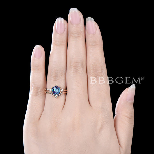 Hexagon Cut Alexandrite Engagement Ring 10k Gold 2pcs Bridal Set