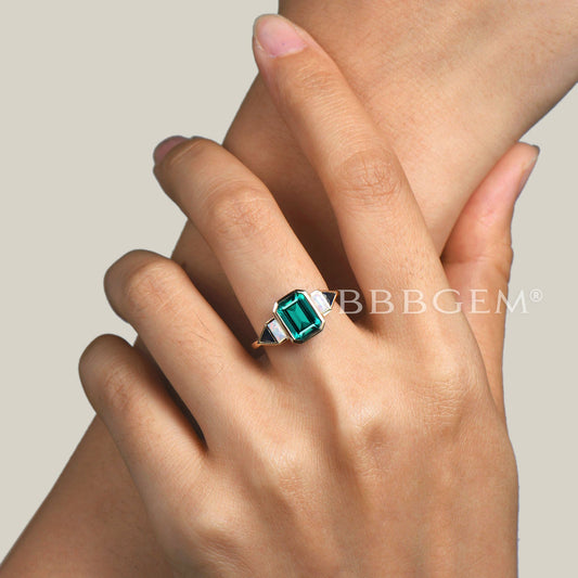 Bezel Set Emerald Cut Emerald Engagement Ring 5 Stone Opal Sapphire Ring