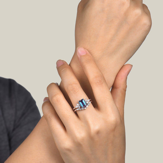 Emerald Cut Alexandrite Engagement Ring 7 Stone Diamond Bridal Set