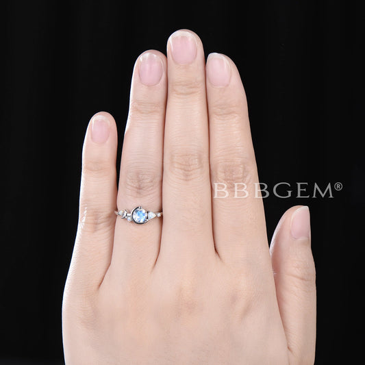 Moon Star Round Natural Moonstone Engagement Ring Opal Wedding Ring