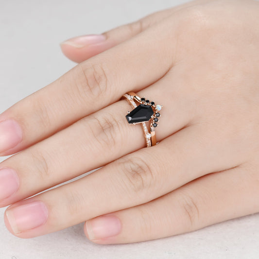 Black Onyx Coffin Gothic Engagement Ring Set Opal Stacking Ring