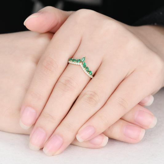 Marquise Emerald Curved Wedding Band Yellow Gold Moissanite Ring