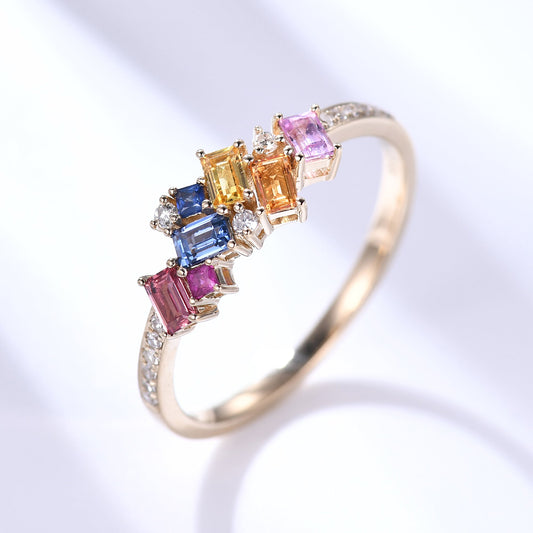 Multi Color Rainbow Cluster Sapphire Diamond Gold Wedding Rings For Women