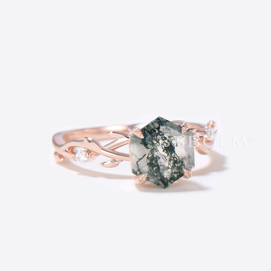 Twig Vine Natural Moss Agate Ring Hexagon Cut Green Moss Ring