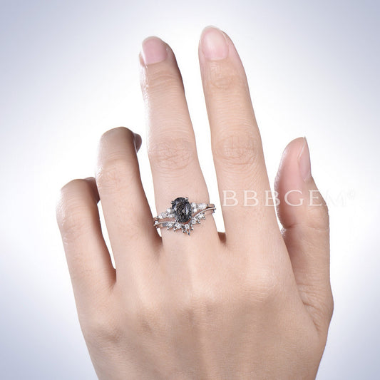 Oval Black Rutilated Quartz Engagement Ring White Gold Moissanite Bridal Set