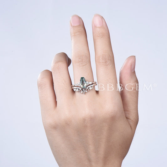 Kite Cut Moss Agate Engagement Ring Set Cluster Black Spinel Ring