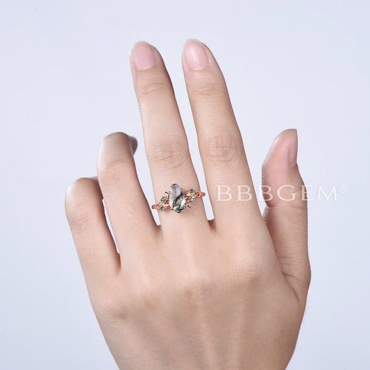 Marquise Natural Moss Agate Engagement Ring Rose Gold 7 Stone Ring