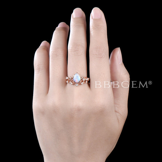 Twig Vine Pear Shaped Sunstone Engagement Ring Leaf Opal Bridal Set