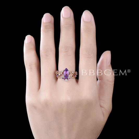 Nature Inspired Marquise Amethyst Engagement Ring Leaf Vine Ring