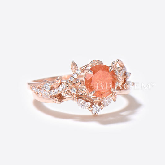 1ct Round Sunstone Engagement Ring Nature Inspired Leaf Wedding Ring