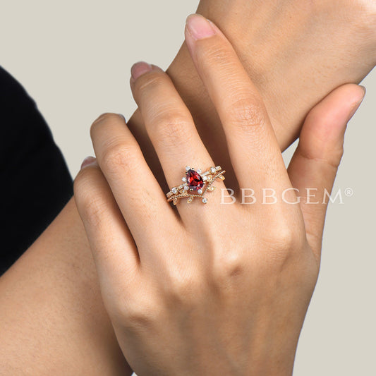 14K Yellow Gold Art Deco Pear Cut Natural Garnet Diamond Bridal Ring