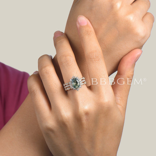 3pcs Oval Cut Natural Moss Agate Diamond Half Eternity Bridal Set Halo Engagement Ring