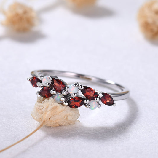 Birthstone Ring Opal Garnet Cluster Wedding Band 14k White Gold Ring for Mom