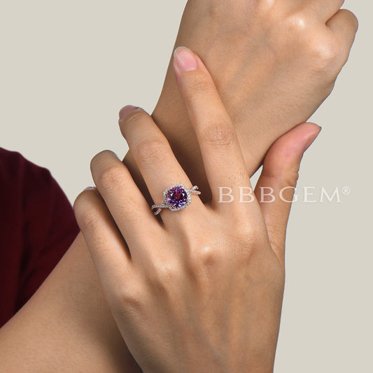 Twisted Round Cut Natural Amethyst Engagement Ring Split Shank Diamond Halo Wedding Ring