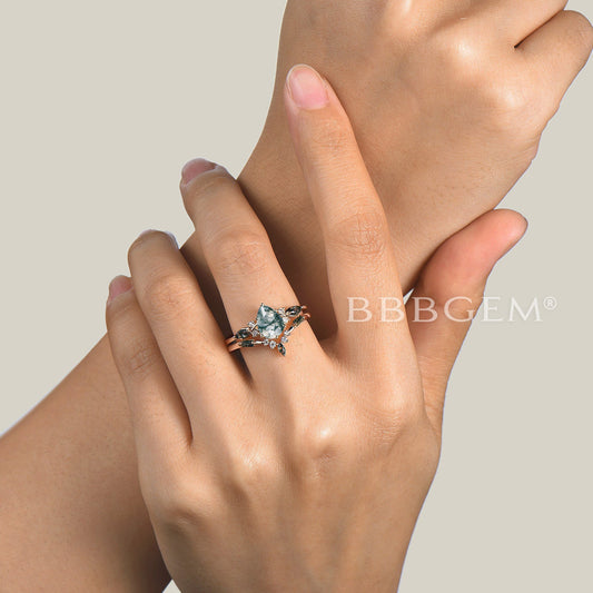Kite Cut Natural Moss Agate Engagement Ring Leaf Nature Inspired Bridal Set