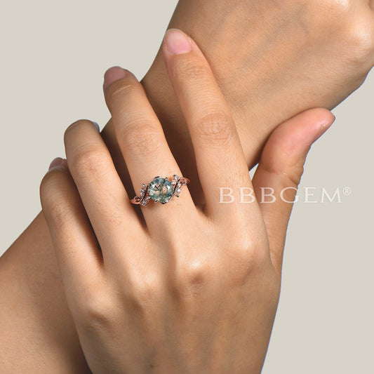Twig Leaf Moss Agate Engagement Ring Diamond Nature Inspired Wedding Ring
