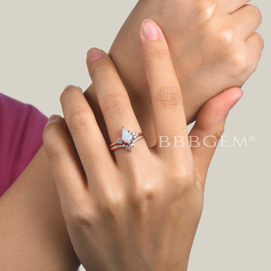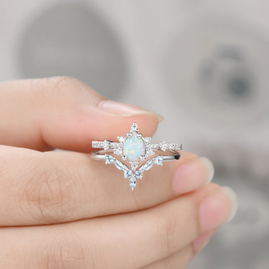 Kite Cut White Opal Engagement Ring Diamond Cluster Bridal Ring Set