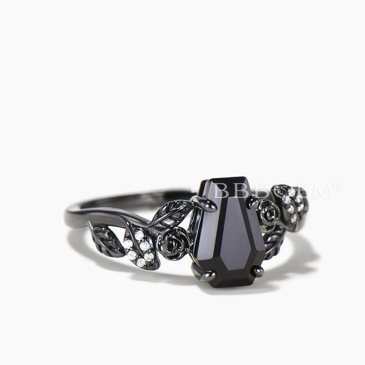 Nature Inspired Black Onyx Coffin Gothic Engagement Ring Unique Black Gold Flower