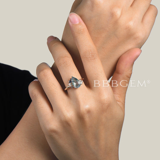 Pear Cut Natural Moss Agate Cluster Engagement Ring Alexandrite Diamond Ring