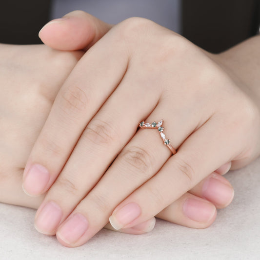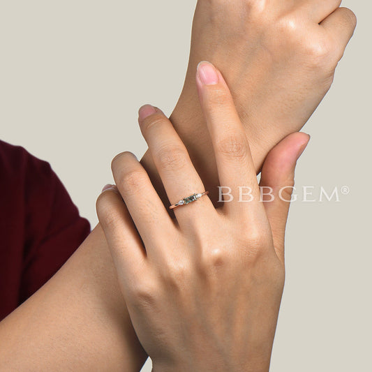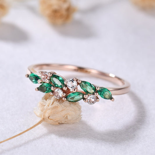 Unique Dainty Emerald Aquamarine Cluster Wedding Band 14k Rose Gold Ring for Mom