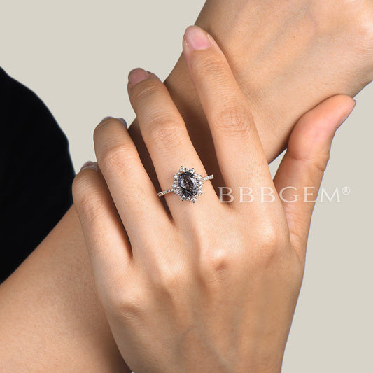 Oval Cut Natural Black Rutilated Quartz Halo Diamond Engagement Ring