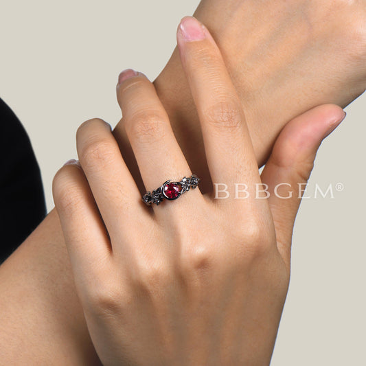 Round Ruby Alerxandrite Moon Gothic Black Leaf Branch Wedding Ring