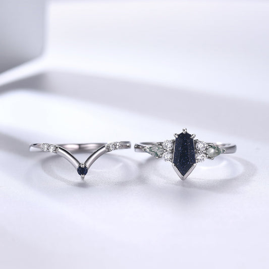 Coffin Galaxy Sandstone Ring Set White Gold Gothic Engagement Ring Unique Nebula Ring
